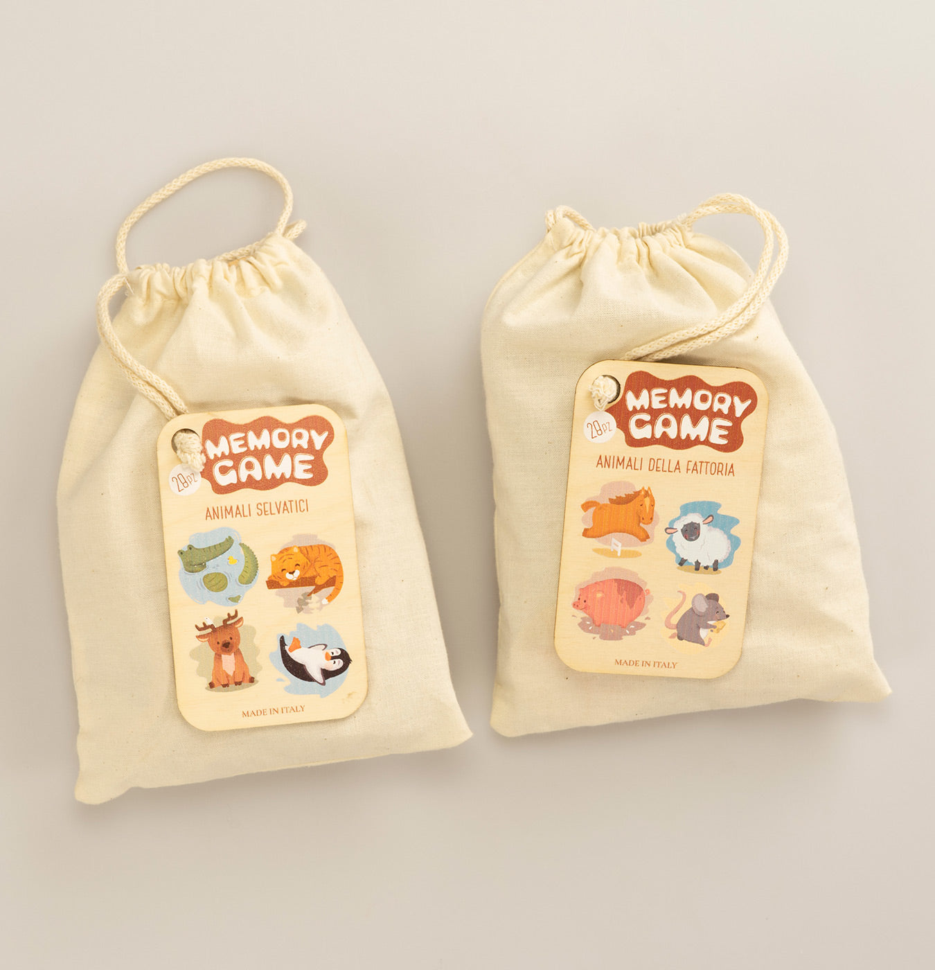 Memory Game con 24 tessere in legno. Disponi le tessere coperte sul tavolo, girane due alla volta mostrandole a tutti. Se i due animali sono diversi, rigirali. Se invece sono uguali, tienili e gioca ancora! Ogni sacchettino contiene anche 4 carte Jolly che aumentano il divertimento.