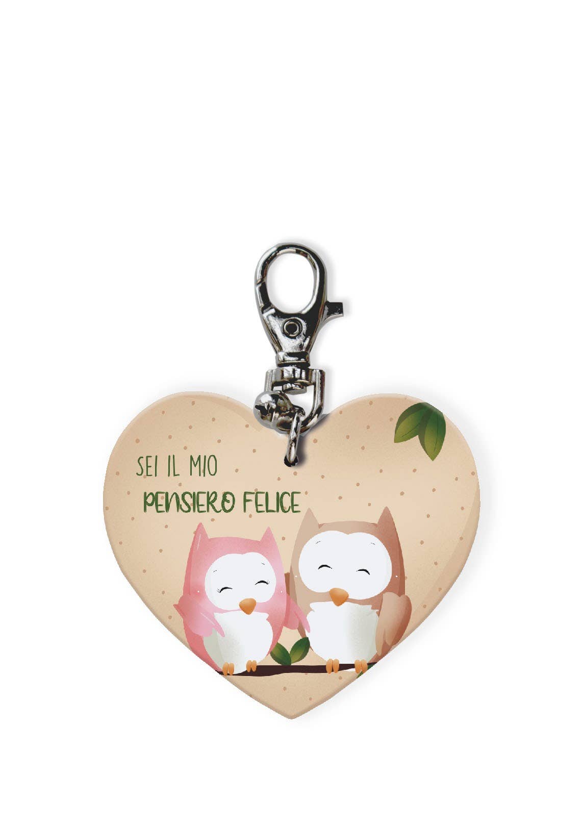MATERIALI -Il cuore è realizzto in HDF (fibra di legno ad alta densità), il moschettone e la campanella in metallo e rifinito con vernici a basa d'acqua. La stampa fronte e retro, in alta definizione, viene applicata sul legno con inchiostri atossici certificati per gli ambienti domestici.
